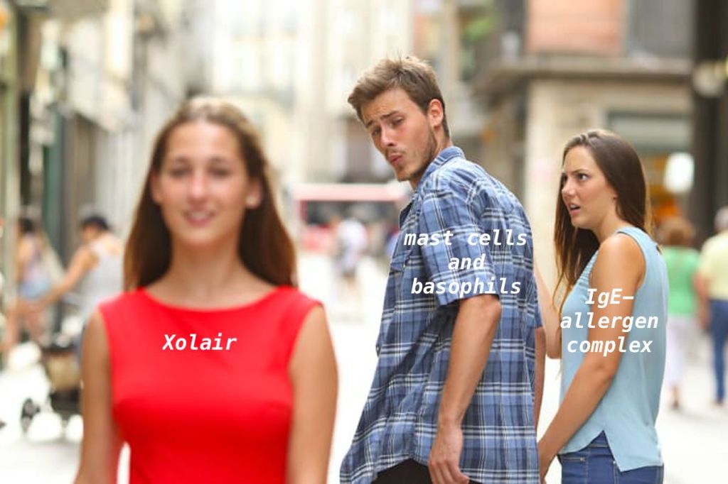 Xolair also increases your risk of helminth infections. This seems peculiar considering that parasites and allergens aren’t exactly related, but they’re closer than you think. IgE, the antibody responsible for dealing with allergens, is also the antibody responsible for helminth infections. In fact, allergies are such a problem in the US because we don’t really have to deal with parasites, so the IgE antibodies started to get a little antsy and responded to harmless substances like pollen, resulting in hypersensitivities and allergic responses. Since Xolair prevents IgE from binding to mast cells and basophils, if IgE actually DOES bind to a helminth, it can’t interact with mast cells and basophils to destroy the invader, allowing it to grow and wreak havoc in your body.